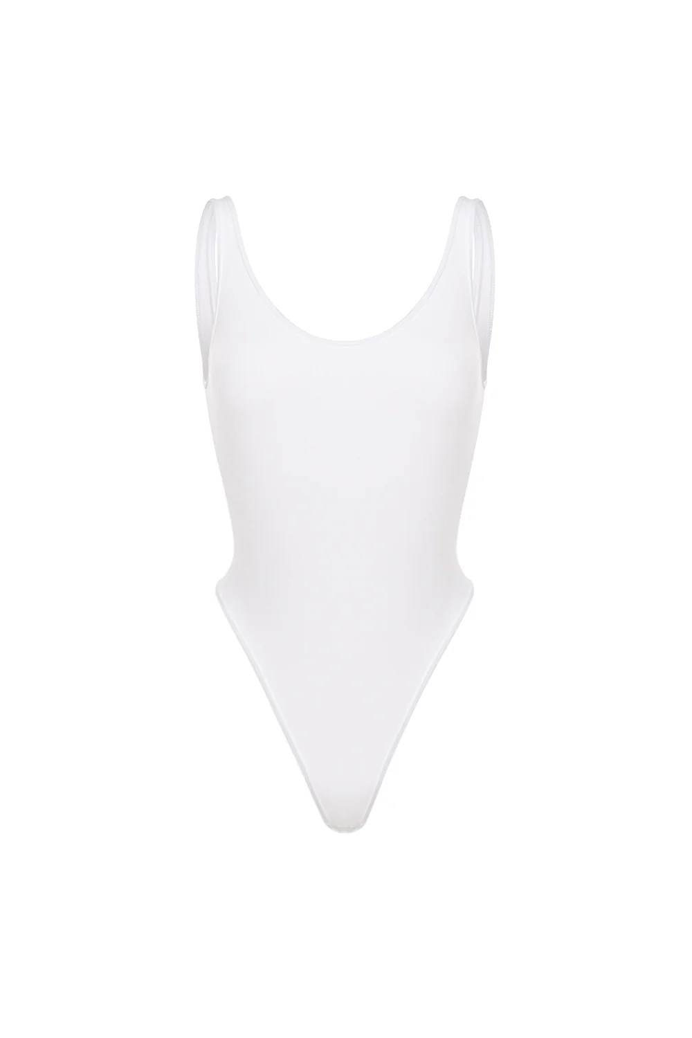A smooth weave bodysuit with straps and a deep cutout on the back.